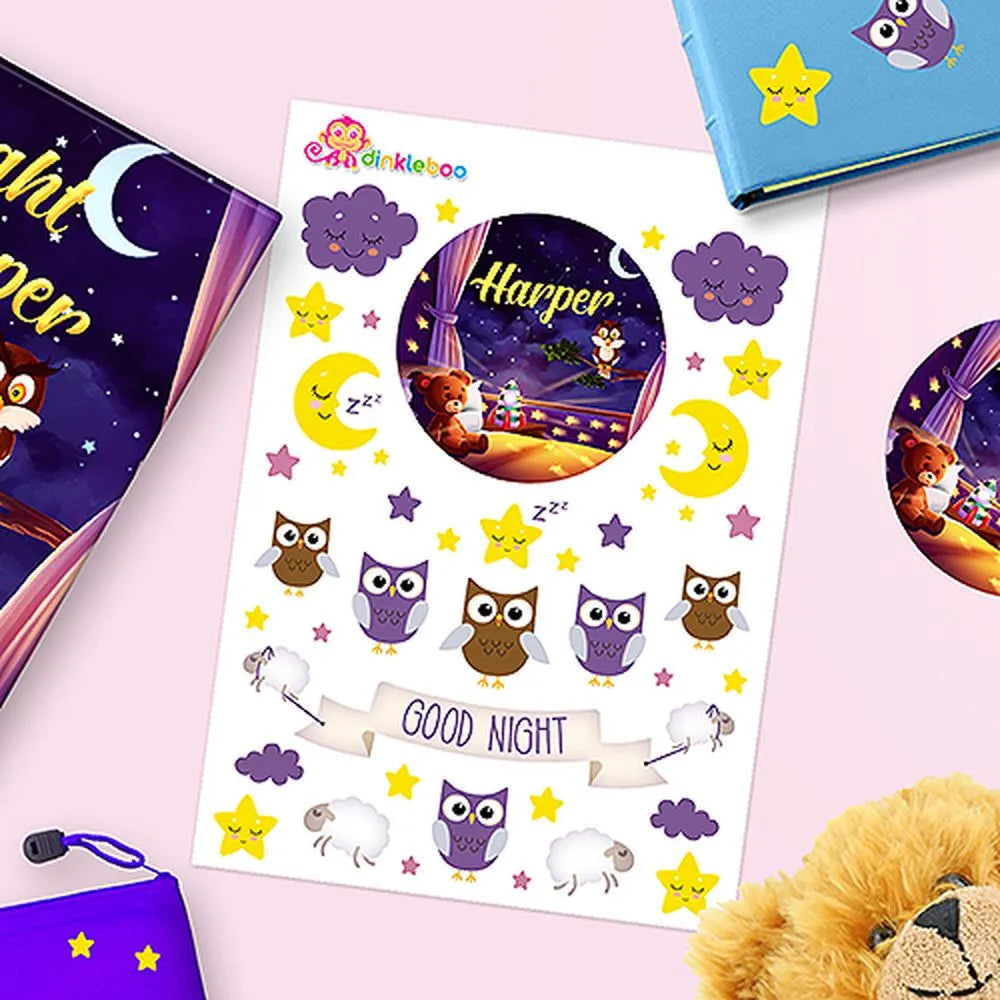 Pack includes one large personalised round sticker, 18 stars, 6 owls, 4 clouds, 5 big stars, 2 moons, 2 sheet and 1 goodnight banner. 39 stickers in total per/sheet.