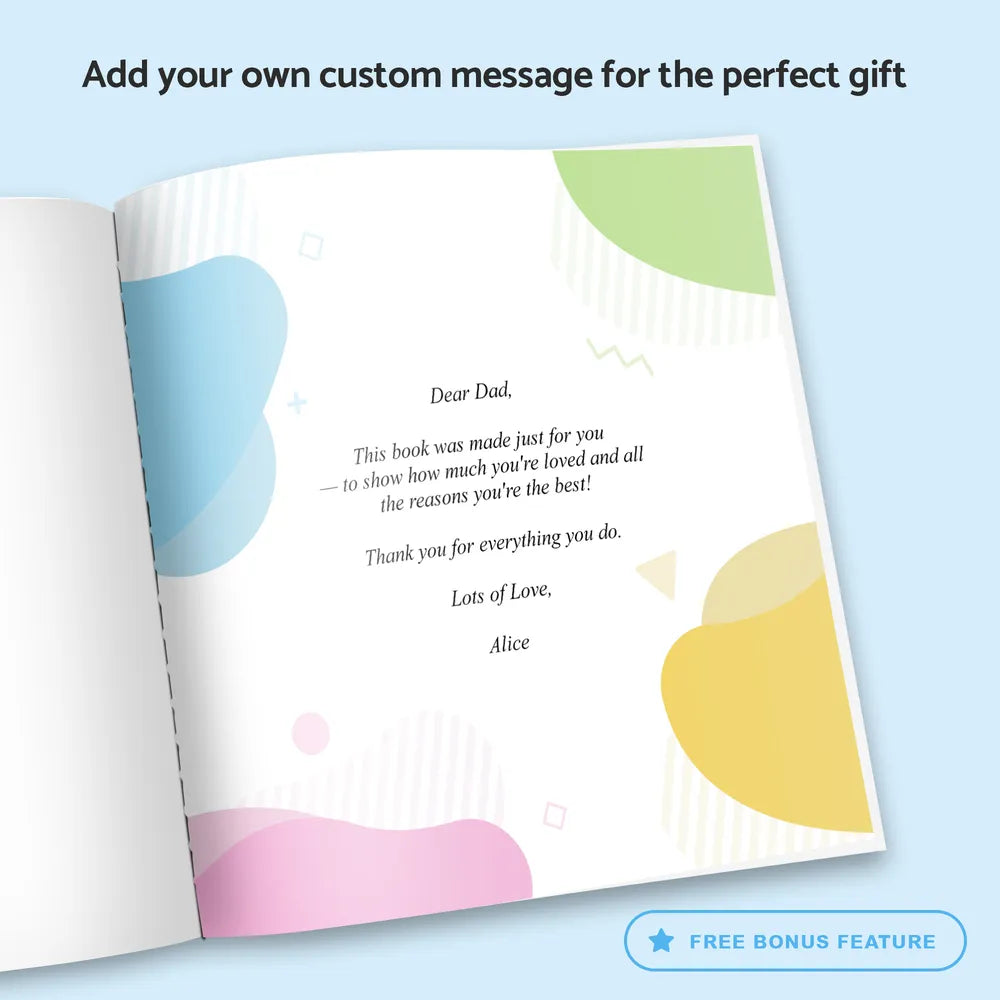 Celebrate the special bond between a child and their dad or father figure with this heartwarming, personalised story book filled with love, laughter and sweet moments. Featuring your child’s name, a custom avatar and a list of reasons they adore their dad, this fun book makes the perfect keepsake for Father’s Day, birthdays or just because.