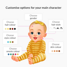 Add name, gender, hair colour, hair style, eye colour, skin tone & select onesie colour