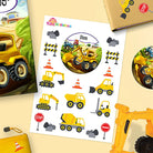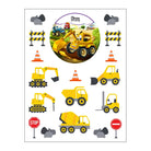 Pack includes one large personalised round sticker, 6 construction trucks, 4 piles of rocks, 3 witches hats, 2 signs, and 2 road blocks. 18 stickers in total per/sheet.