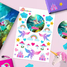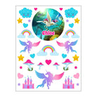 Pack includes one large personalised round sticker, 10 stars, 9 hearts, 4 mushrooms, 3 unicorns, 3 rainbows, 2 castles and 2 clouds. 34 stickers in total per/sheet.