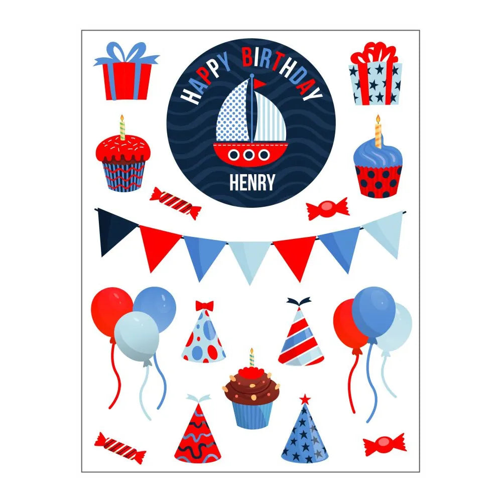 All kids love stickers? Pack includes one large personalised round sticker, 4 party hats, 4 lollies, 3 cupcakes, 2 balloons, 2 presents, and 1 bunting. 17 stickers in total per sheet.