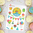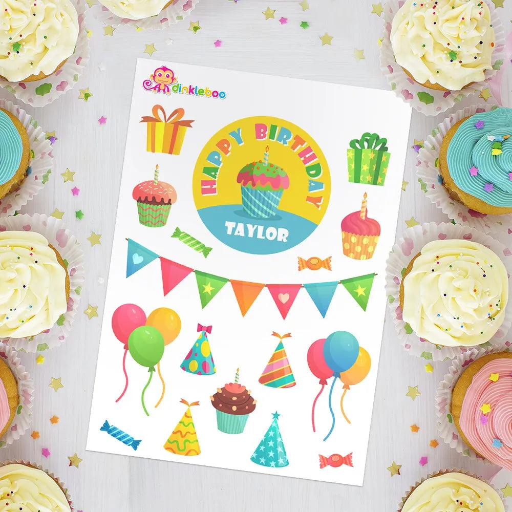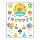 All kids love stickers? Pack includes one large personalised round sticker, 4 party hats, 4 lollies, 3 cupcakes, 2 balloons, 2 presents, and 1 bunting. 17 stickers in total per sheet.